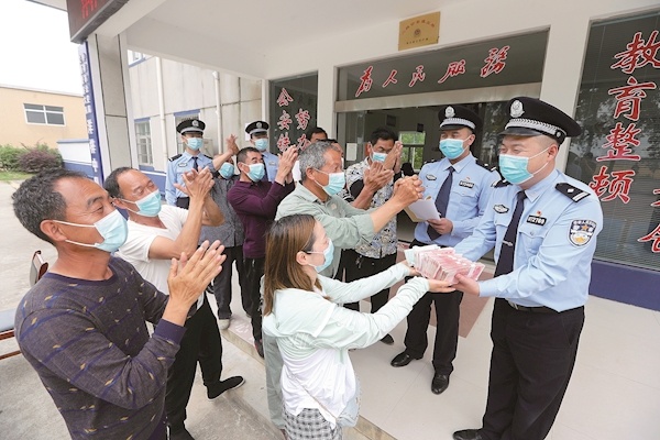 民警将追缴的工资款发放给农民工 摄影:楚天都市报极目新闻通讯员陈龙