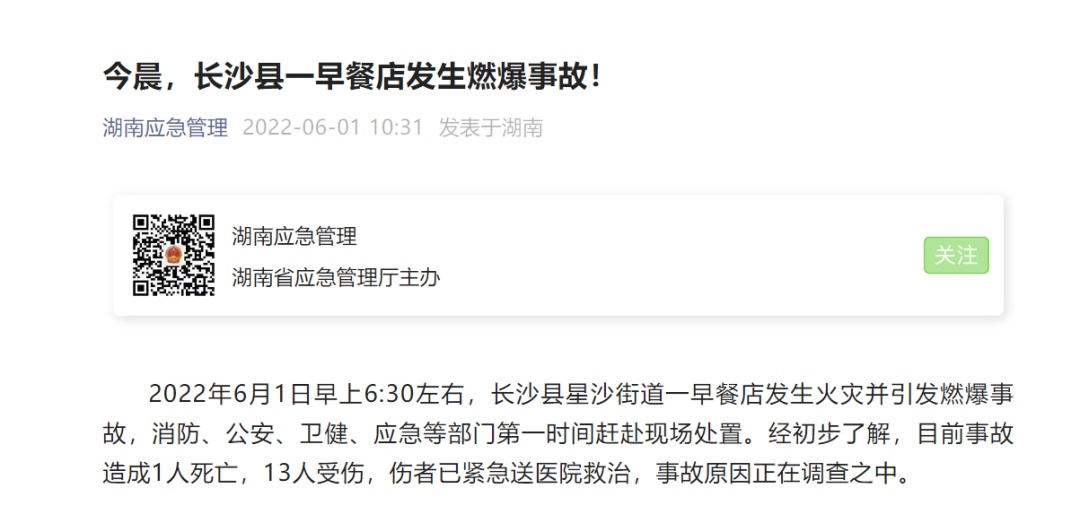 6月1日早上6时30分许,长沙县星沙街道一早餐店发生火灾并引发燃爆事故。