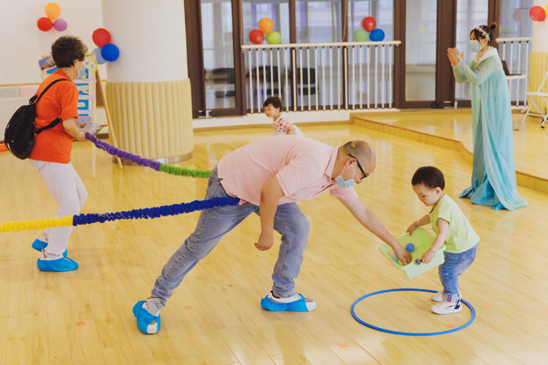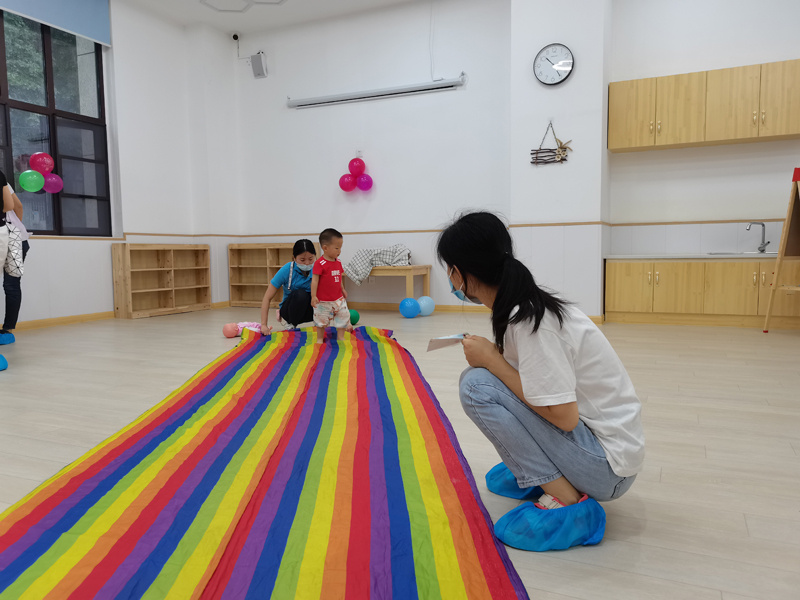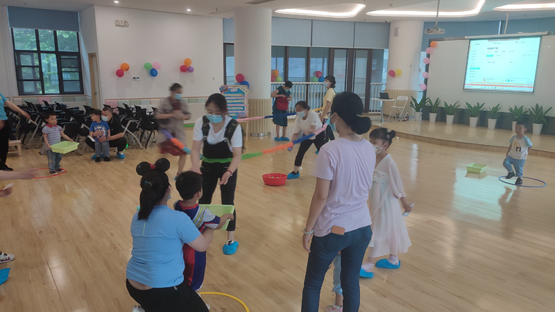 主题讲座结束后,是寓教于乐的游戏环节。爬跳、投掷、钻圈......每个游戏都是根据婴幼儿年龄及身体发育的特点而设置的,分别考量婴幼儿的大运动、精细运动、语言、认知、社交情绪、自我帮助等各方面的能力。