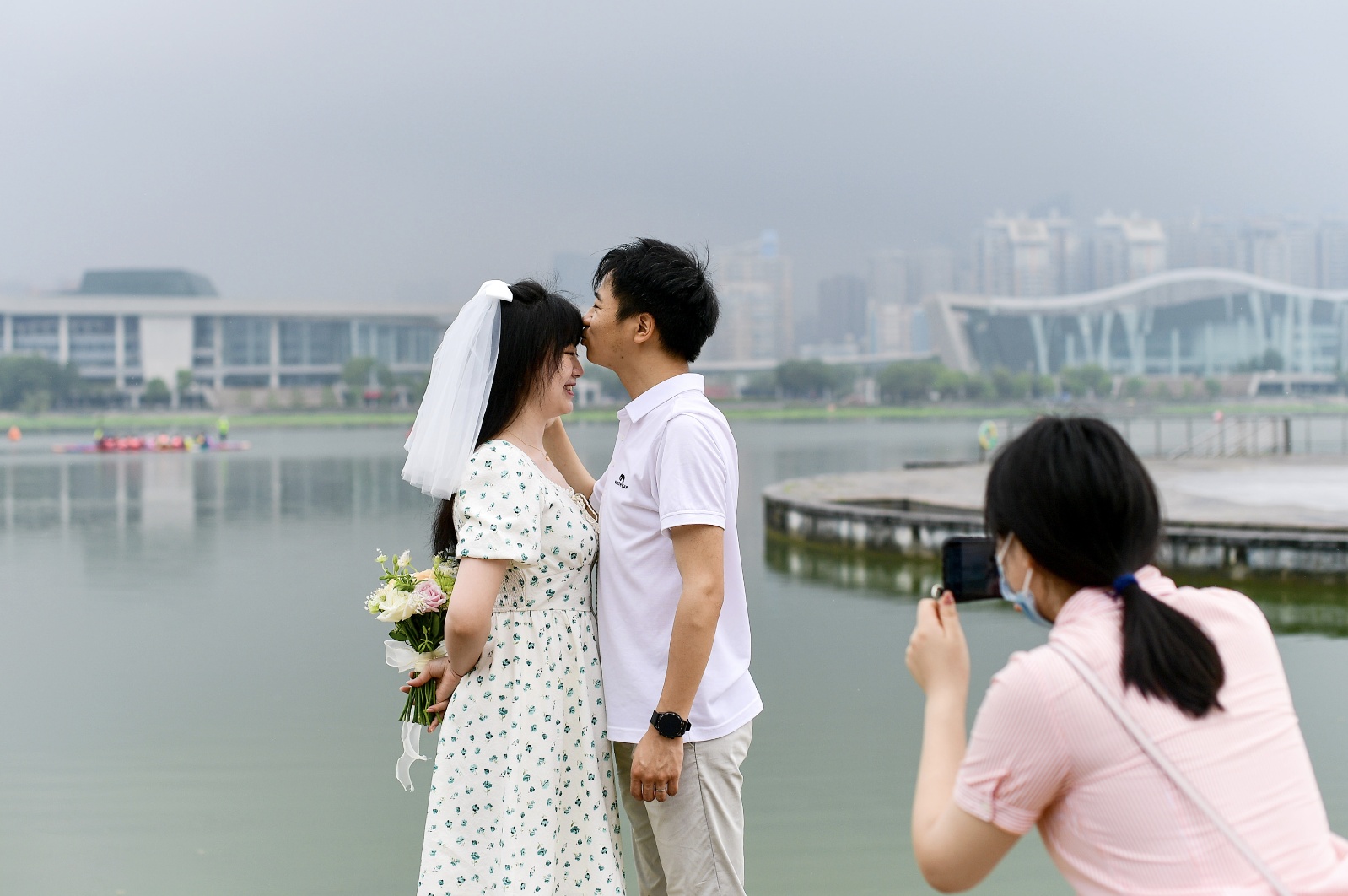 当天上午的月湖风景区内,走几步就会在林间、草坪、湖畔旁看见刚领完证,正在户外景观拍照的新人。余磊和杨慧婷就是特地请了一天假来月湖领证的,杨慧婷还专门带上闺蜜来当“跟拍摄影师”。在室内证婚点留影后,二人又冒着小雨来到了月湖湖畔继续拍照。