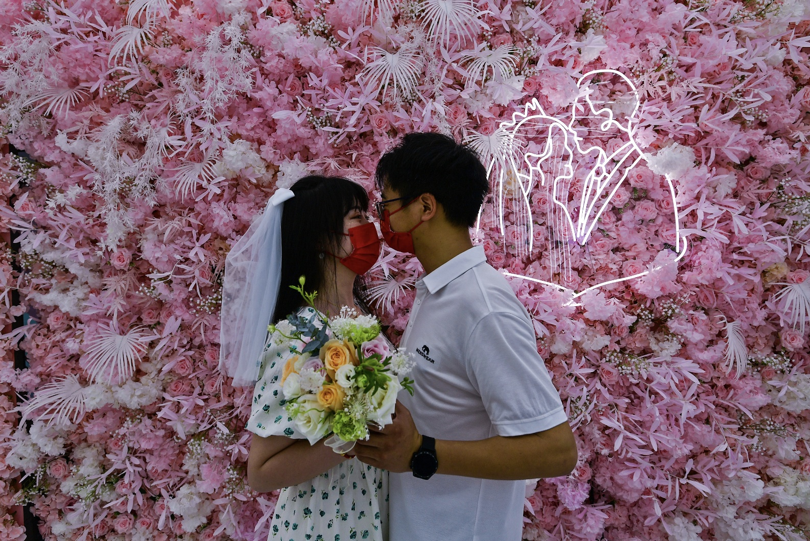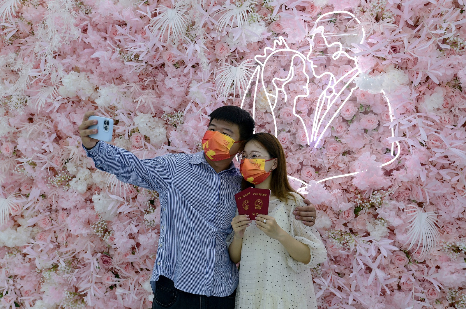 月湖结婚登记点位于月湖风景区凤凰广场旁,上午8时30分刚刚开放,等待区就已排起了队。登记点内,粉白相间的垂纱与拱门形设计的办证窗口让人感觉步入了神圣殿堂。羽毛主题的粉色打卡墙和白色证婚点前,不断有新人带着自备的手花和头纱合影留念。