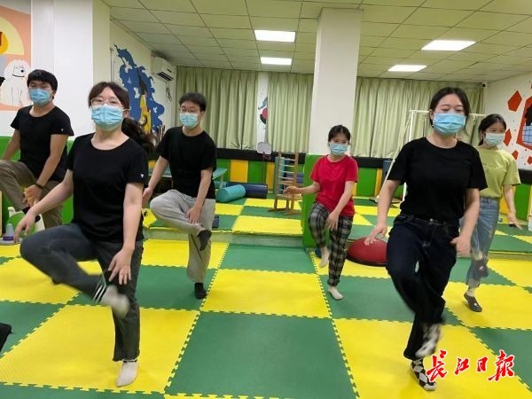 儿童康复科医护人员在活动前排练舞蹈。记者张越 摄