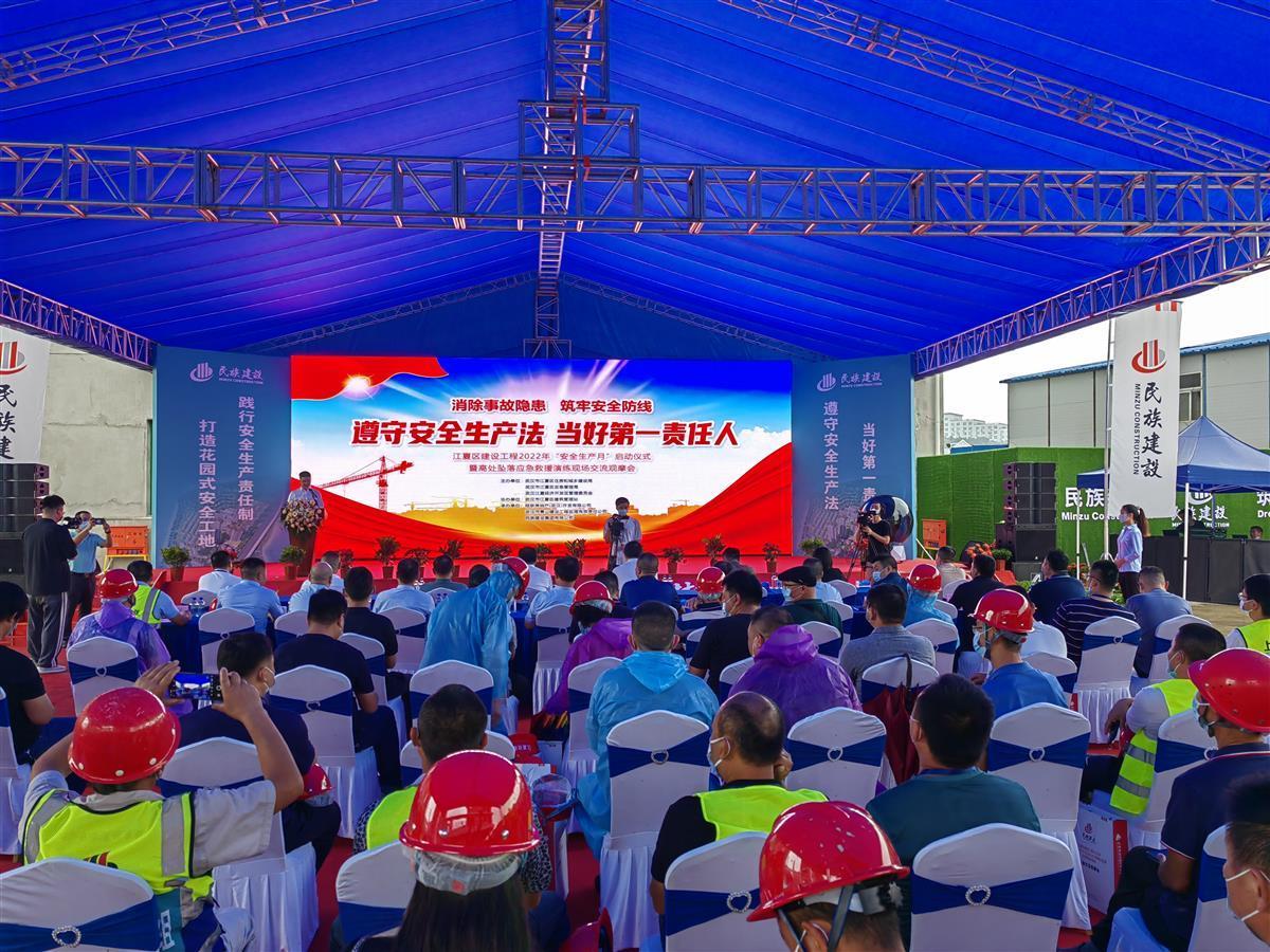 原来,这是民族建设集团在该项目举行的一场高处坠落应急救援演练的视频。当日,江夏区建设工程2022年“安全生产月”启动仪式在民族建设集团项目工地举行。与会主管政府部门、各工程建设单位代表接受了一场“沉浸式”的安全教育。