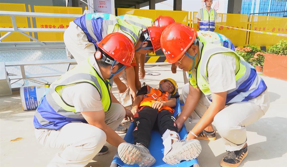 “收到,收到!立即启动高处坠落应急救援预案。”柯经理当即答复。警戒隔离现场,关闭施工电源,取出救援器具救援,现场紧急医疗救护,通过救护车转运……项目人员各司其职,现场应急处置一气呵成,赢得一旁的观摩人员点头称赞。