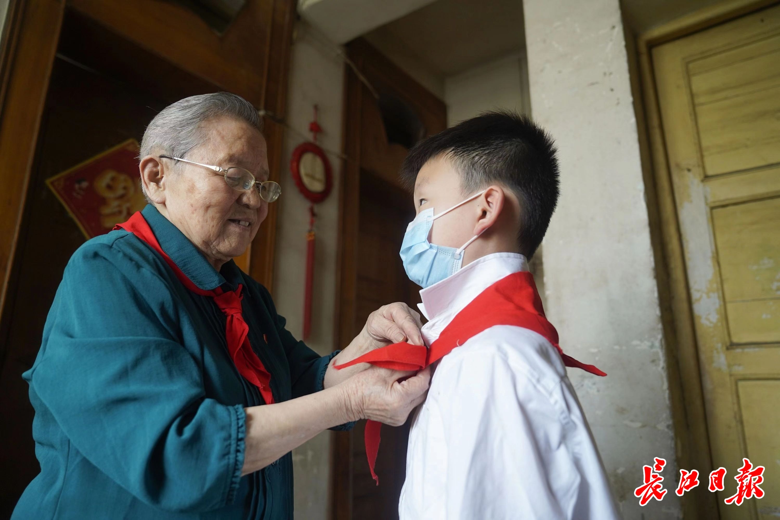 新中国首批少先队员魏需武奶奶亲手为少先队员王修远佩戴红领巾。长江日报记者彭年 摄