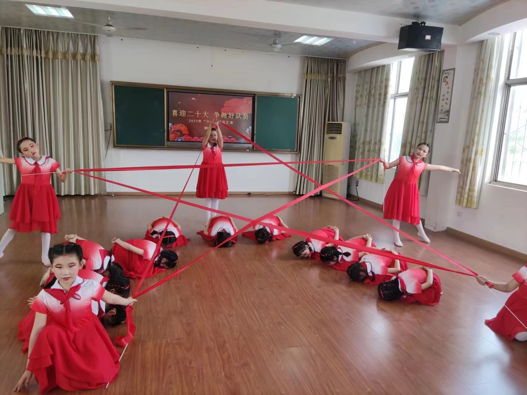 青山区钢城九小校舞蹈队表演《不忘初心》,小演员们摆出红星造型,表达对党的热爱。通讯员樊全斌 摄