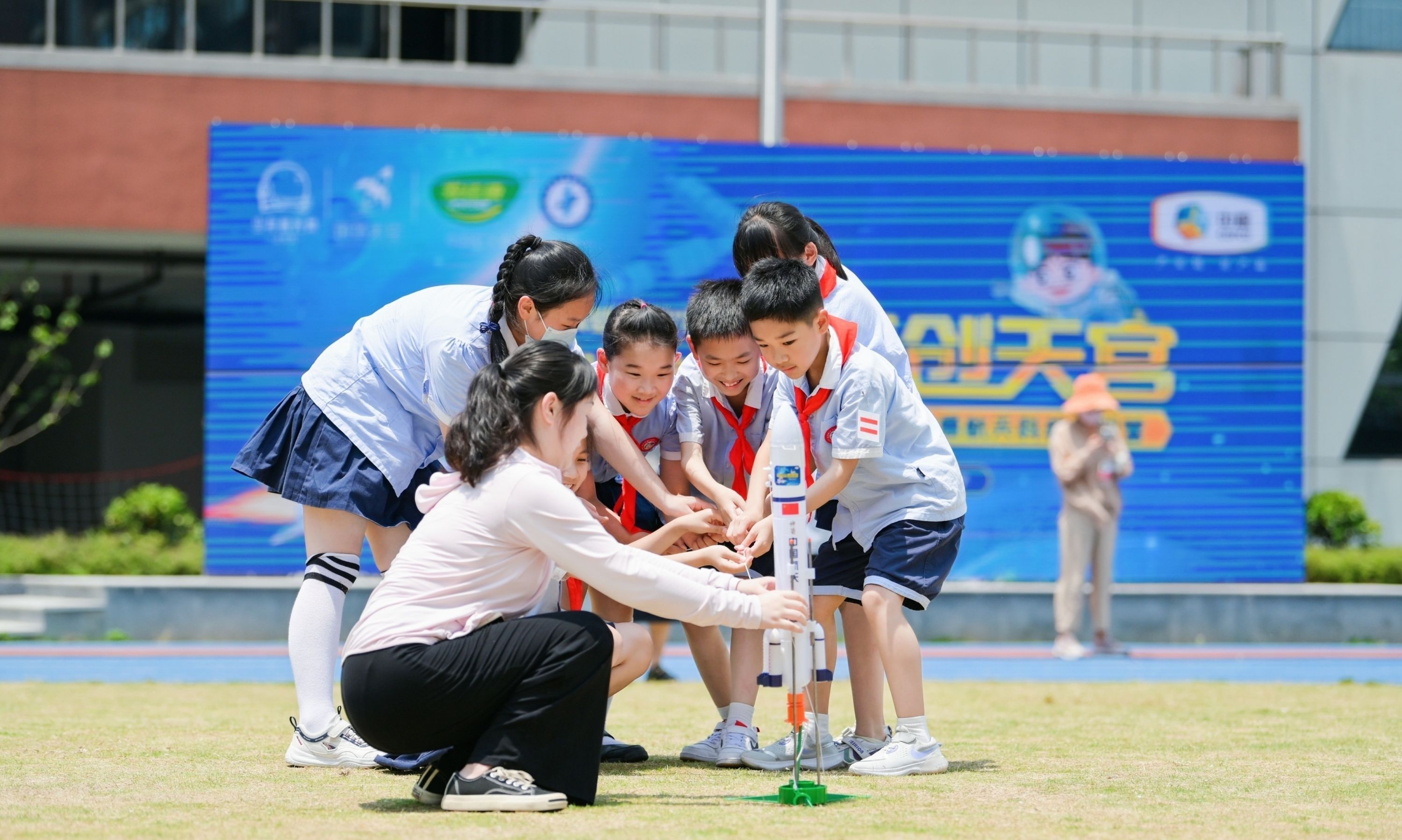 江岸区育才怡康小学的孩子们体验发射“小火箭”。通讯员田丽娟 摄