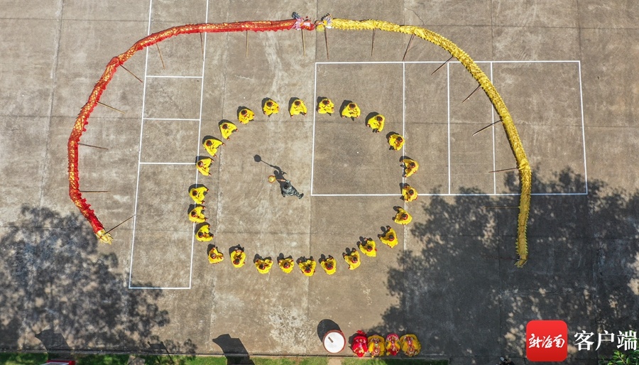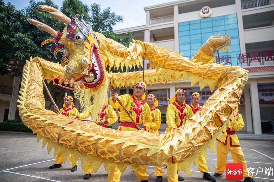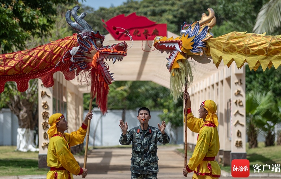 端午节即将到来,武警海口支队某中队驻地内,两条长龙伴随着动人的旋律翻腾跳跃,18名官兵挥舞支棒大步游走,不断变化阵型,将游、穿、腾、缠、等各种动作一气呵成。