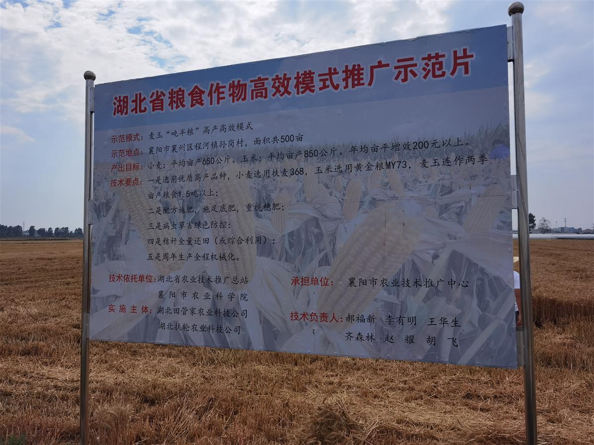 湖北日报全媒记者现场看到,示范田边还竖着一块指示牌——襄阳麦玉“吨半粮”高产高效模式示范田。