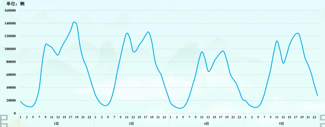 端午期间,预计全省高速公路路网流量较平稳,各日流量分布较为均衡,但每天仍将呈现“双峰”变化趋势,早高峰8:00-11:00,晚高峰16:00-19:00。