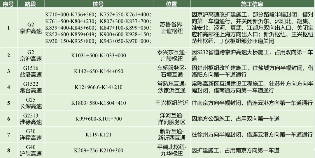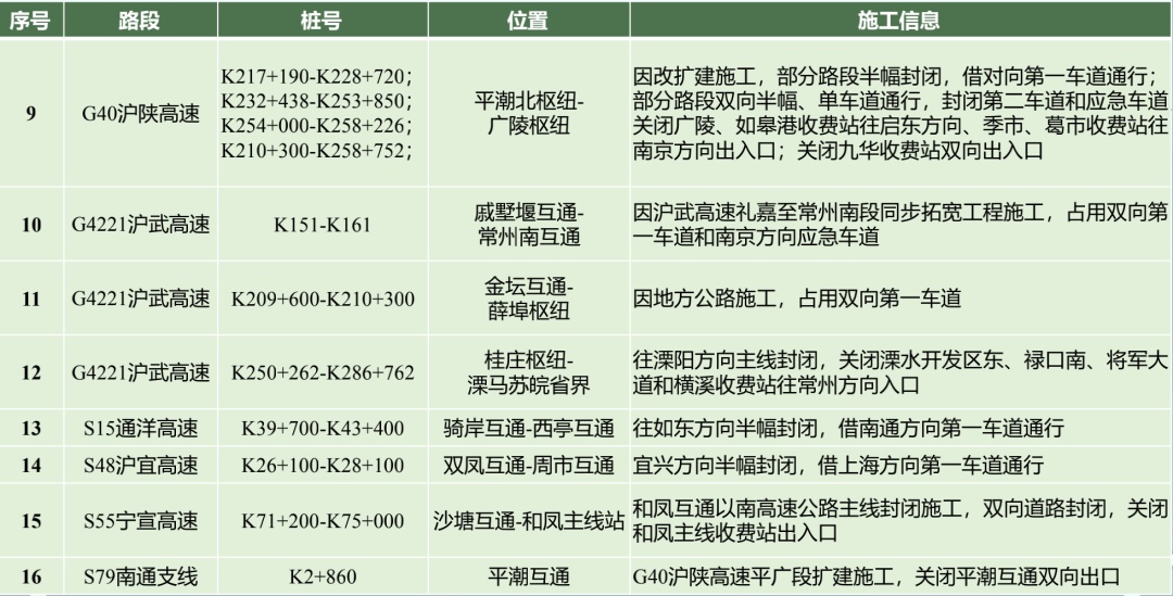 端午期间 ,省内有G2京沪高速、G40沪陕高速等16处高速公路施工路段、节点,请注意现场交通标志提示!