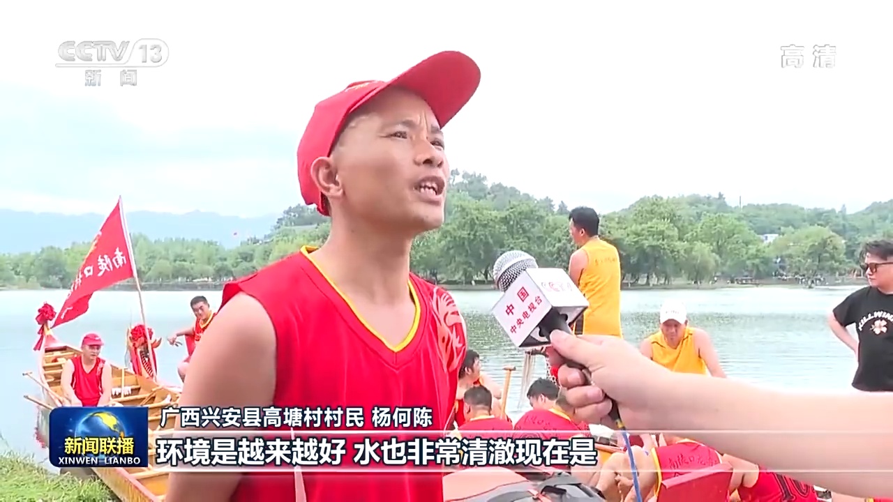 广西兴安县高塘村村民 杨何陈:环境是越来越好,水也非常清澈现在是,然后我们就组织起来搞这个龙舟赛,也是希望国泰民安,风调雨顺。