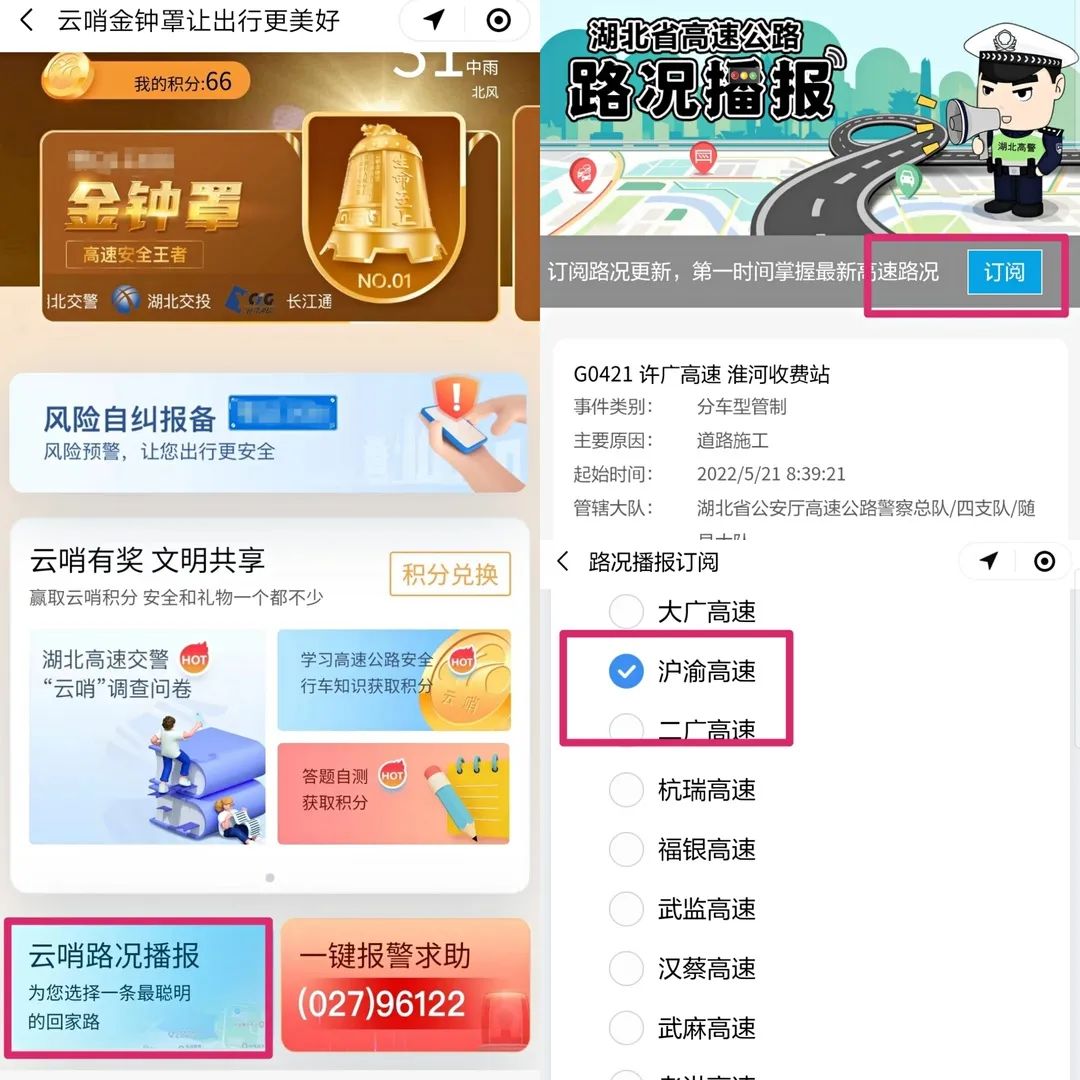 建议您关注湖北高速交警微信公众号,进入“云哨金钟罩”小程序“云哨路况播报”板块,订阅相应的省内高速路况信息,第一时间了解获取返程路况。
