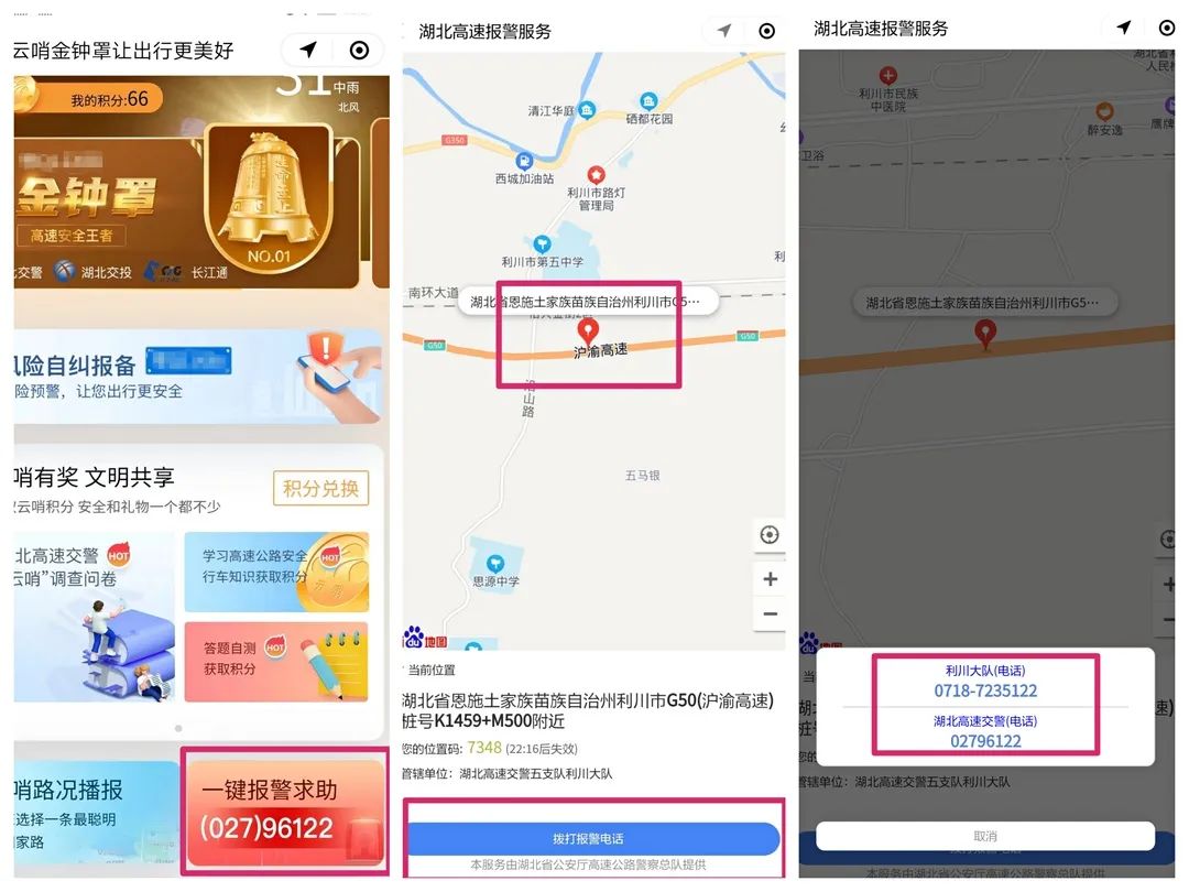 紧急情况下,若您无法确定自己的定位,可以通过“云哨金钟罩”小程序“一键报警求助”板块,获取您的精确位置后,直接使用“拨打报警电话”功能快速报警求助,我们将在第一时间前往救援。