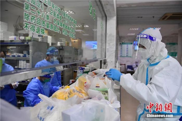 上海市虹口区凉城新村街道广灵二路居委会社区下沉干部疫情期间为居民取药。中新社记者 田雨昊 摄