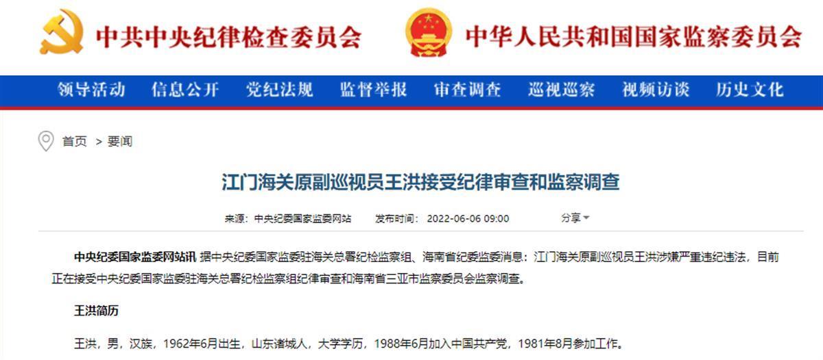 中央纪委国家监委网站6月6日发布消息,据中央纪委国家监委驻海关总署纪检监察组、海南省纪委监委消息:江门海关原副巡视员王洪涉嫌严重违纪违法,目前正在接受中央纪委国家监委驻海关总署纪检监察组纪律审查和海南省三亚市监察委员会监察调查。