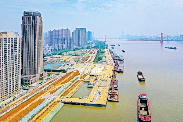 6月6日,位于武汉市汉阳江滩的杨泗港都市T台项目防洪工程全部完工,目前正在进行景观工程施工。据介绍,杨泗港都市T台工程是百里长江生态廊道工程的重要组成部分,项目规划工程堤防全长约1974米,建设面积近23万平方米,将依托现有的码头、铁轨等建筑基底,打造广阔的亲水平台,构建山、水、路、岸、产、城等一体化生态空间,预计今年10月建成。