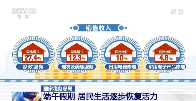 增值税发票数据显示,端午假期期间,居民服务销售收入同比增长12.9%,其中,家政服务、理发及美容服务、日用电器修理、家用电子产品修理销售收入同比分别增长27.4%、12.3%、10%、4.8%,反映居民生活正在恢复往日活力。