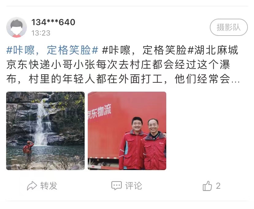 网友134***640上传了两名京东快递小哥的照片。其中,来自湖北麻城的京东快递小哥小张每次去村庄都会经过一个瀑布,村里的年轻人都在外面打工,他们经常会寄一些东西给自己的父母孩子,小张就是村里的“捎信人”。京东快递小哥小魏每天去取件的路上,既有热闹的商贩,也有专注的玉雕师,他也在用自己的力量,守护着家乡的人间烟火。