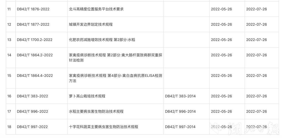 这18项新标准涵盖了食品快检技术、农副产品、分别是:食品安全快速检测实验室建设规范、食品快速检测产品评价用盲样制备技术规范、食品快速检测产品评价技术规范、中药材野葛生产技术规程、露地花椰菜周年高效栽培技术规程、肉用饲料油菜发酵全混合日粮生产技术规程、饲用油菜青贮技术规程、葡萄设施栽培技术规程、水稻育秧中心建设技术规范、大棚西瓜化肥农药减施增效生产技术规程、北斗高精度位置服务平台技术要求、城镇开发边界划定技术规程、萝卜高山栽培技术规程、水稻主要病虫害生物防治技术规程、十字花科蔬菜主要病虫害生物防治技术规程等。