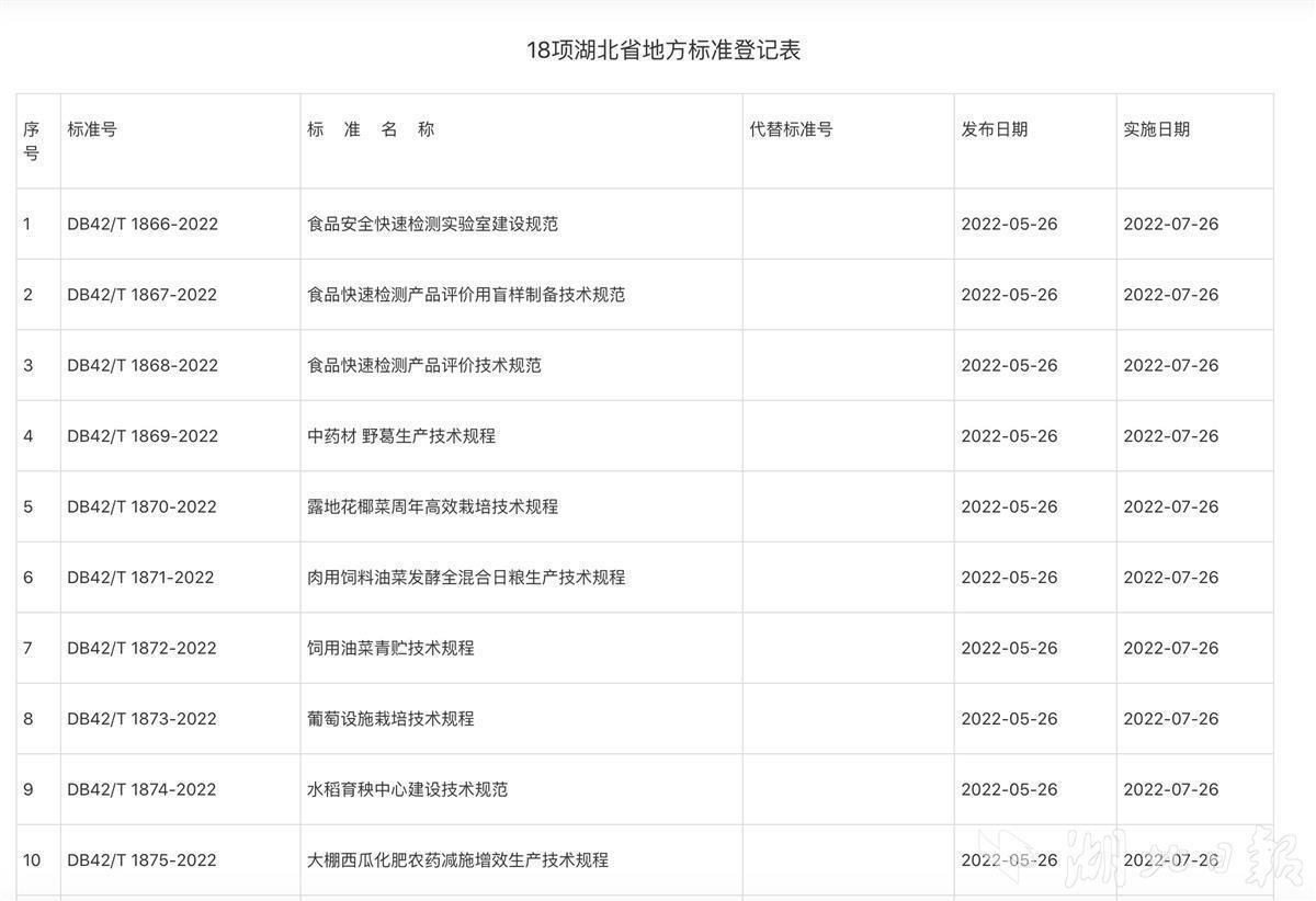 湖北日报讯(记者汪子轶)近日,湖北省市场监管局批准发布《食品安全快速检测实验室建设规范》等18项地方标准。这18项新“地标”根据《湖北省地方标准管理办法》批准通过并正式发布,并且都将于7月26日正式实施。标准正文和有关备案信息可通过地方标准信息服务平台(http://dbba.sacinfo.org.cn/)查询。