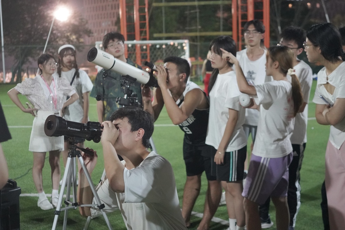 傍晚时分,操场上搭起顶顶帐篷,同学们在草地上聊天,享受青春仲夏夜。在活动环节,同学们用塑料饮料瓶做成水火箭机身,将水火箭灌入水,利用打气筒充入空气,只听“嘭、嘭”几声,一道道强大的水柱将火箭猛烈地推向了高空,现场水花四溅。随后,在该校天文社学生的引导下,他们学习用不同的天文望远镜观测星空。活动还邀请了乐队驻场歌唱,在浪漫美妙的音乐声中,同学们用沙画、粘土DIY,绘出自己心中最美的星辰。