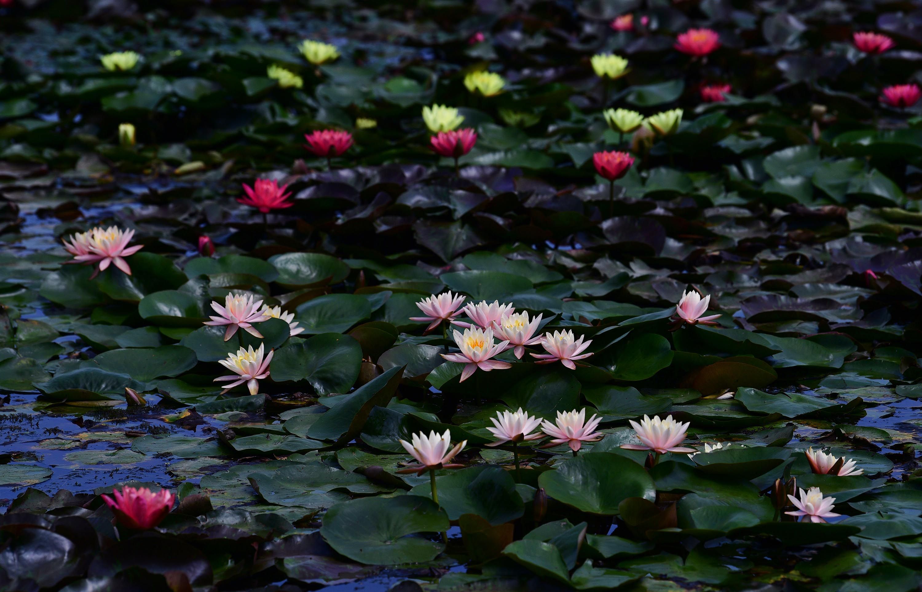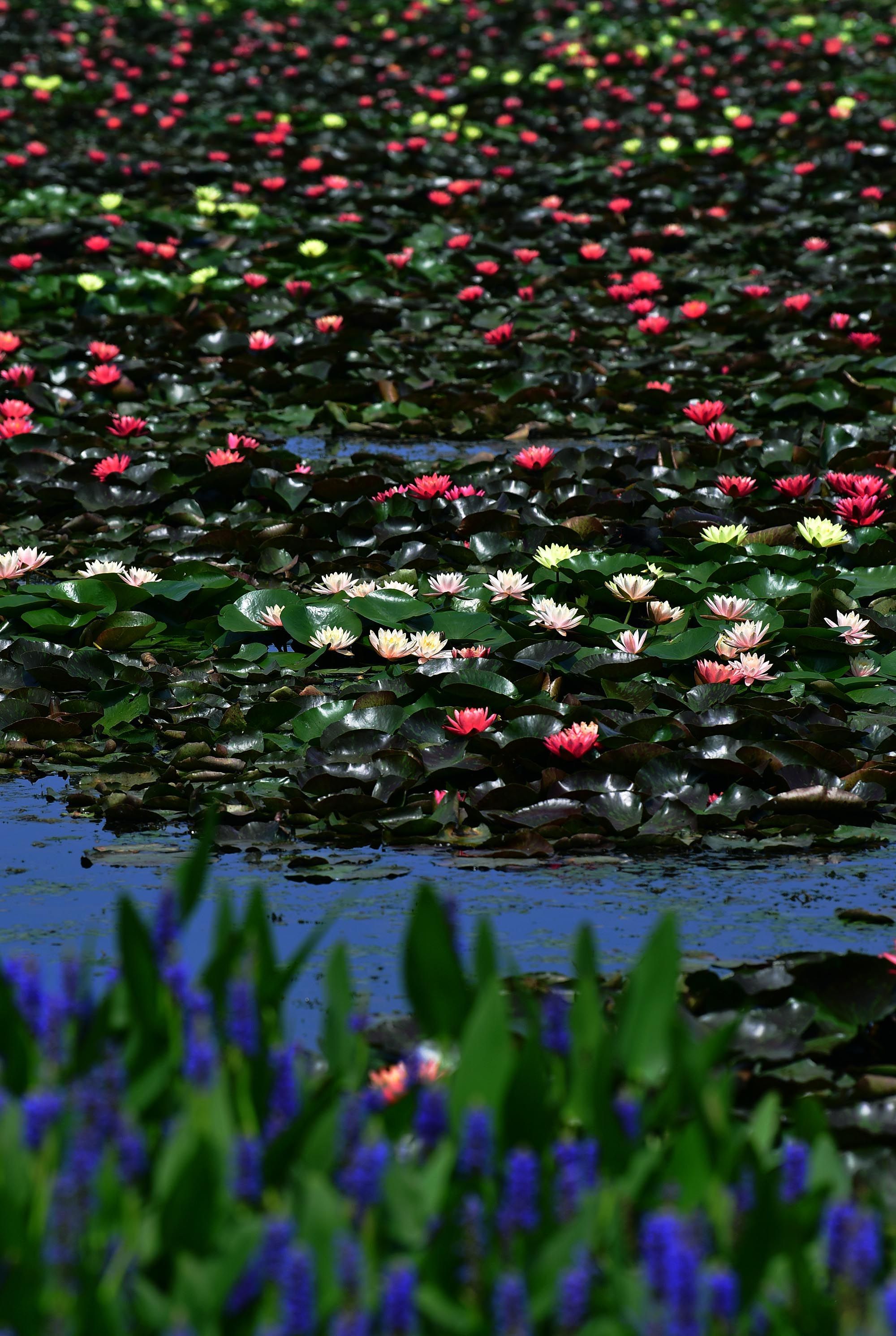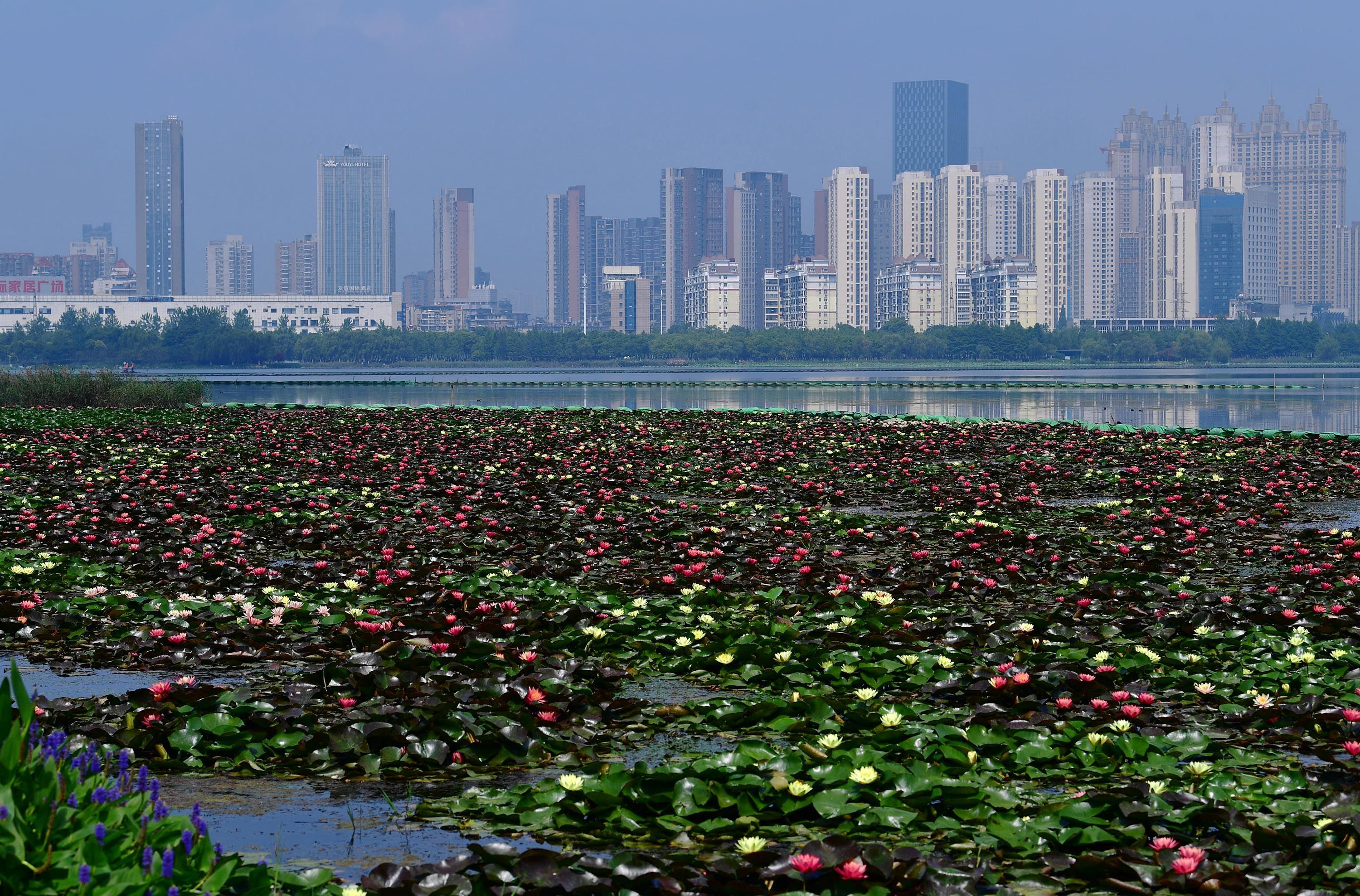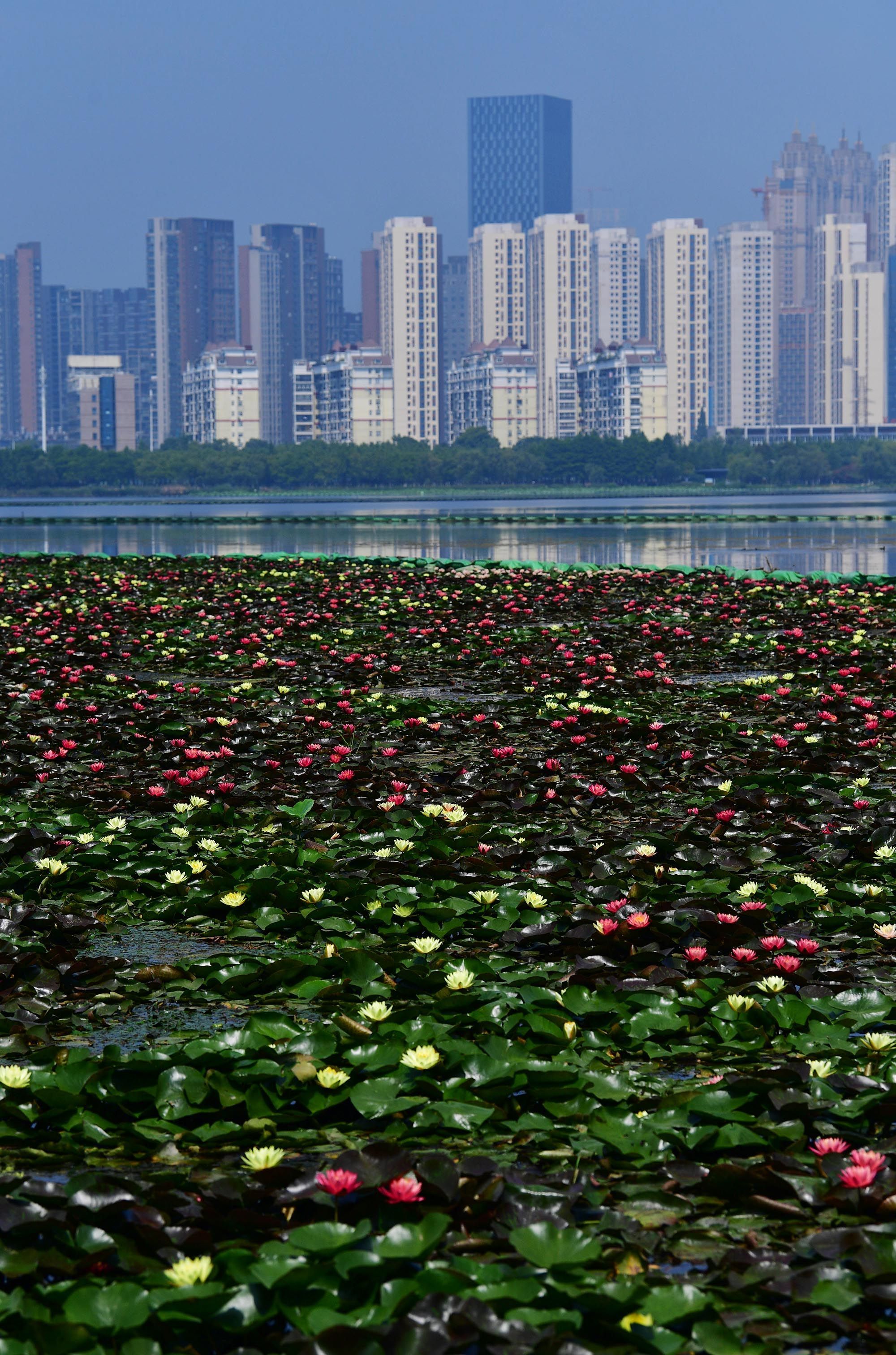 6月8日,武汉骄阳似火,夏天的味道十足。沙湖公园南8门附近,上万平方米的湖面被红色、黄色、粉色的睡莲花和墨绿色的叶片覆盖。站在岸边向湖面望去,满眼都被美色铺满,令人沉醉。
