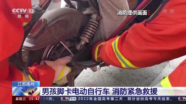 最近,江苏省扬州市开发区扬子江路,一个男孩乘坐电动自行车时,脚被卡在车后轮与车毂的空隙中,接警后,当地消防救援人员迅速前往现场进行救援。