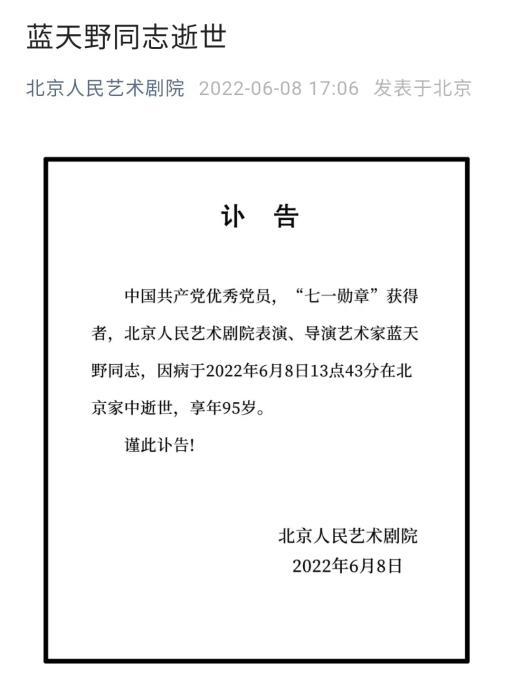 中新文娱北京6月8日电(刘越)据北京人民艺术剧院公众号消息,老艺术家蓝天野因病于6月8日在北京家中逝世,享年95岁。