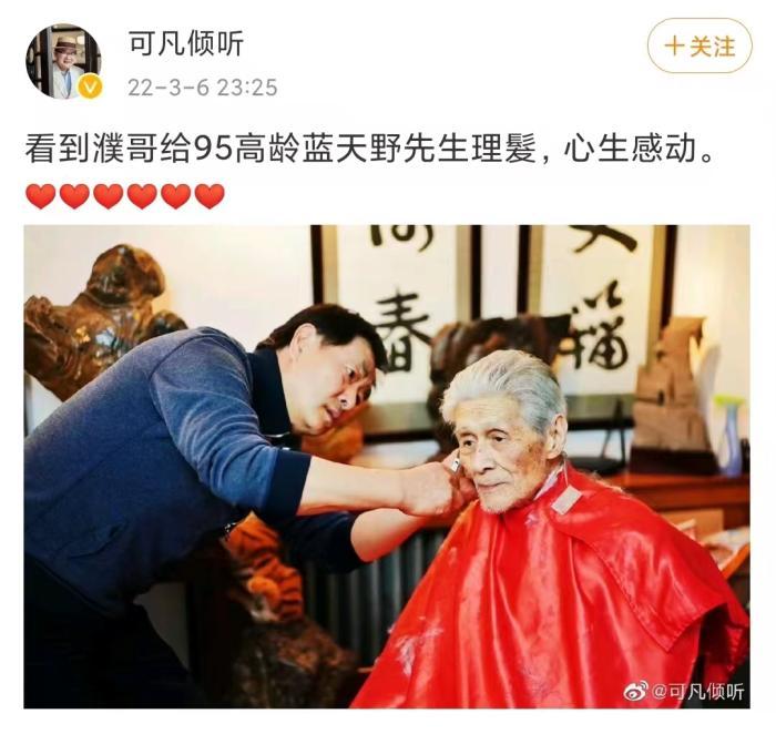 濮存昕给蓝天野理发。主持人曹可凡微博截图
