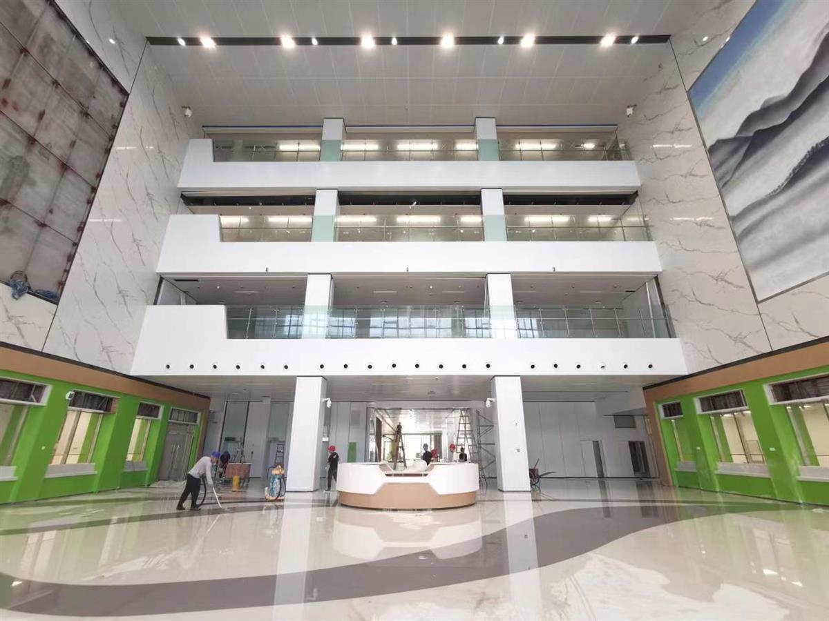 门诊大厅挑空4层设计,挑空高度达18米。进入门诊大厅,通透的“医街”宽达10米,直达医技楼、住院部。“医街”采用苹果绿色,透着温馨。检验科位于“医街”中段,方便门诊、住院患者直接检查,不让患者有“迷宫”的感觉。