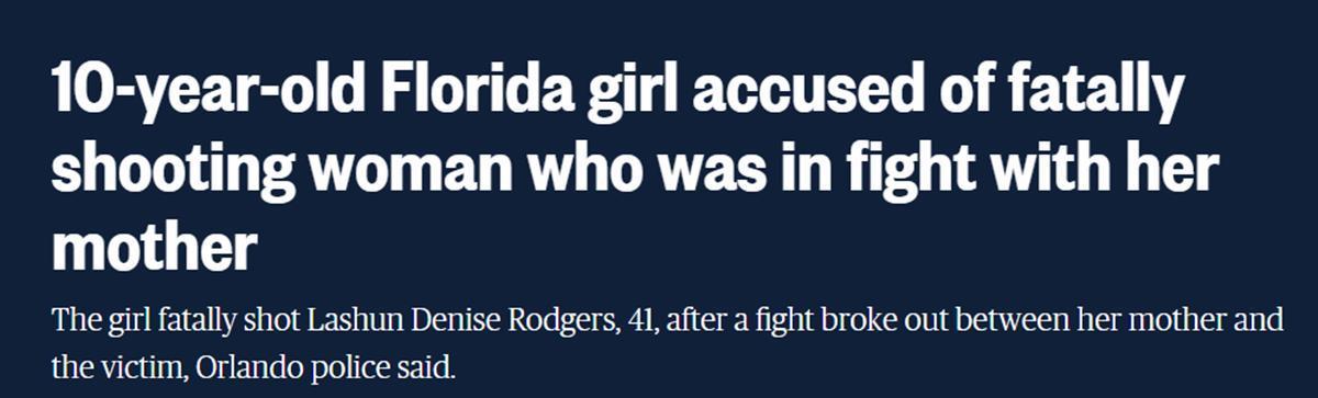 近日,美国佛罗里达州一名10岁的小女孩开枪打死了与她母亲打架的妇女。据美国全国广播公司(NBC)6月8日报道,当局6月7日表示,女孩可能会被指控犯有谋杀罪。