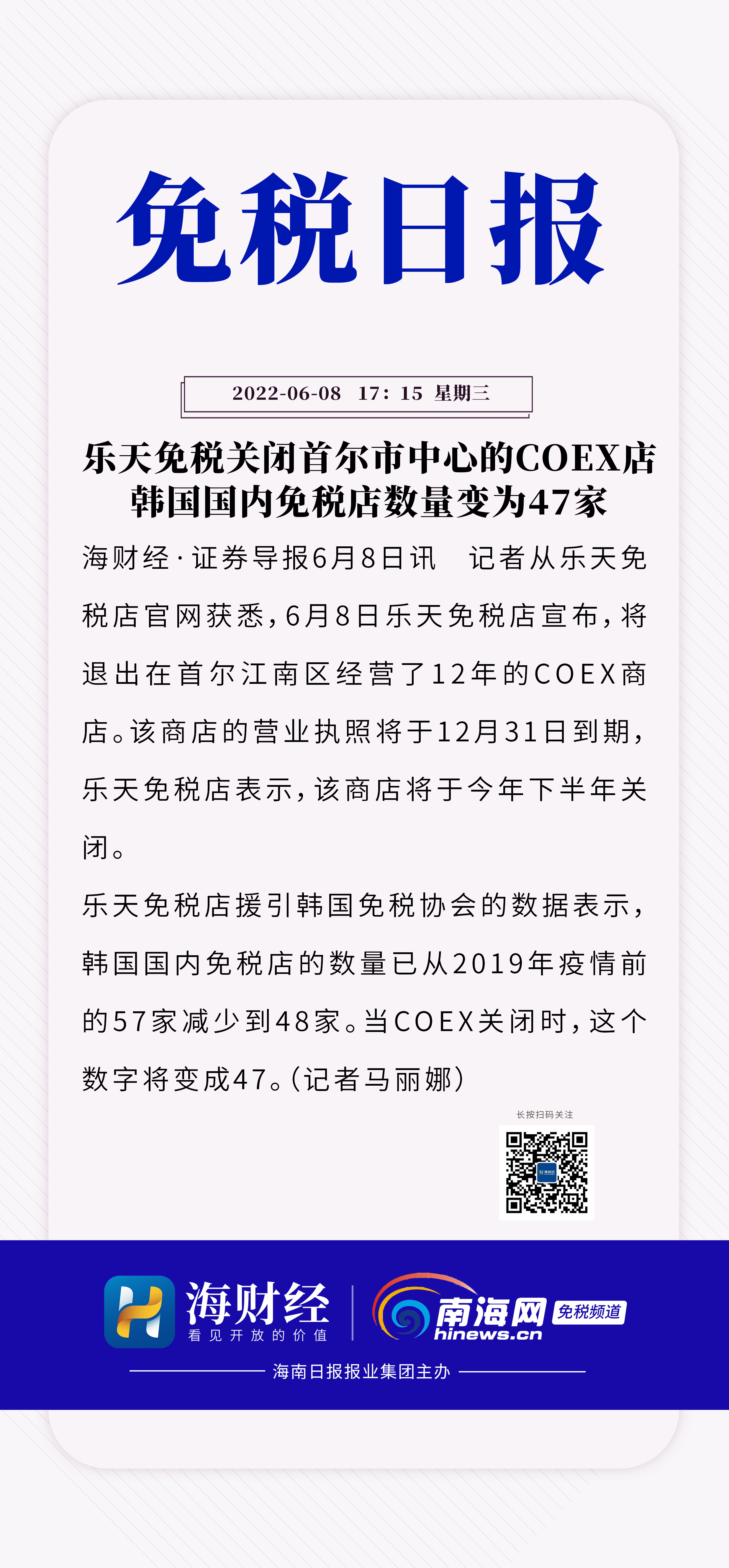 海财经·证券导报6月8日讯(记者 马丽娜)记者从乐天免税店官网获悉,6月8日乐天免税店宣布,将退出在首尔江南区经营了12年的COEX商店。该商店的营业执照将于12月31日到期,乐天免税店表示,该商店将于今年下半年关闭。