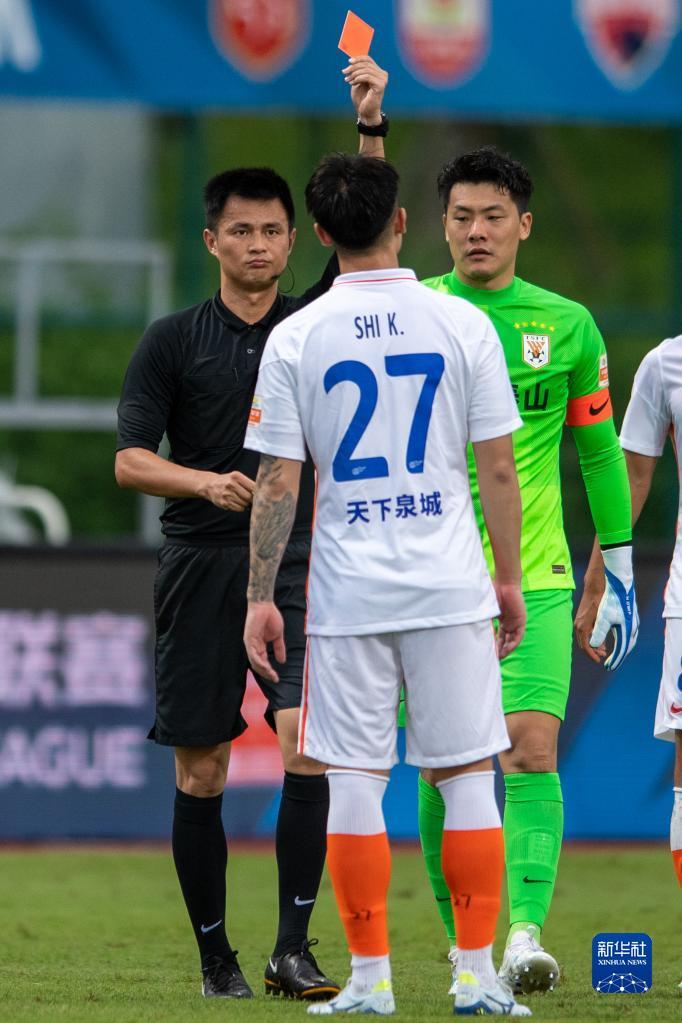 6月8日,主裁判李海新(左)在比赛中向山东泰山队球员石柯(中)出示红牌。新华社记者 胡智轩 摄