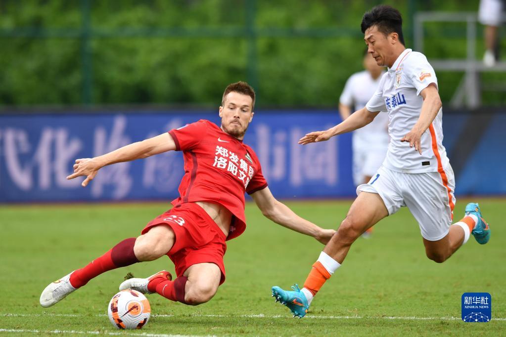 6月8日,河南嵩山龙门队球员阿德里安(右)在比赛中。新华社记者 胡智轩 摄
