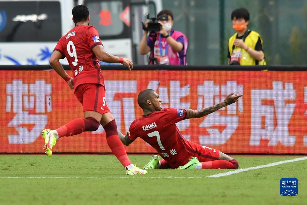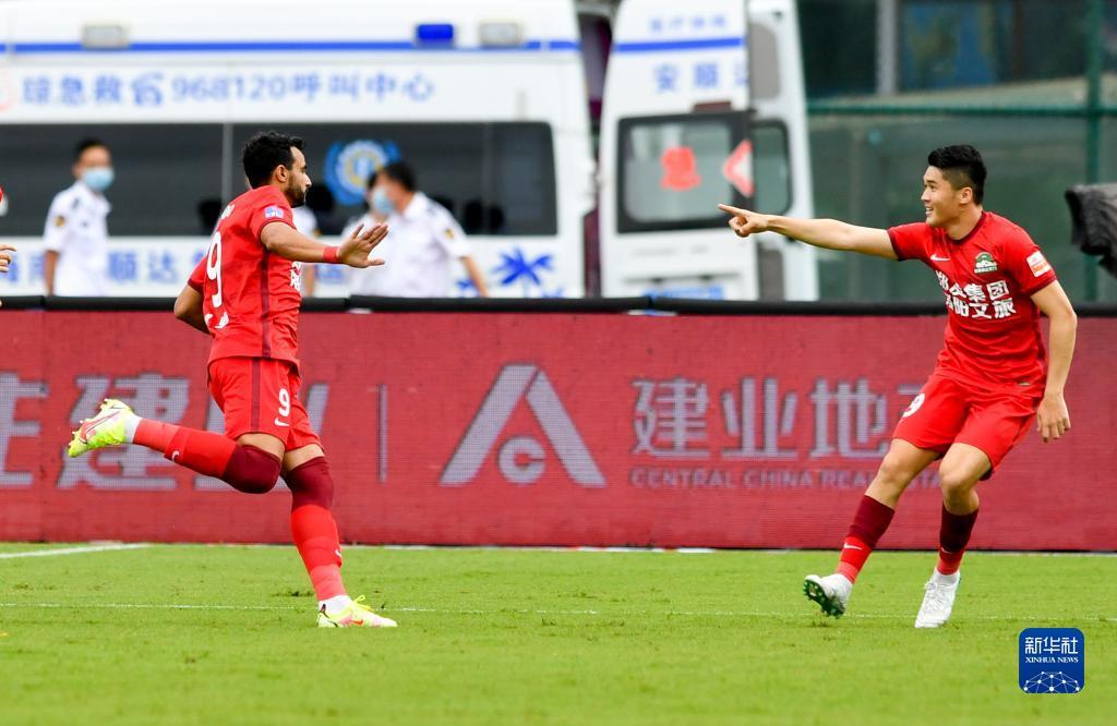 6月8日,河南嵩山龙门队球员卡兰加(右)在进球后庆祝。新华社记者 胡智轩 摄