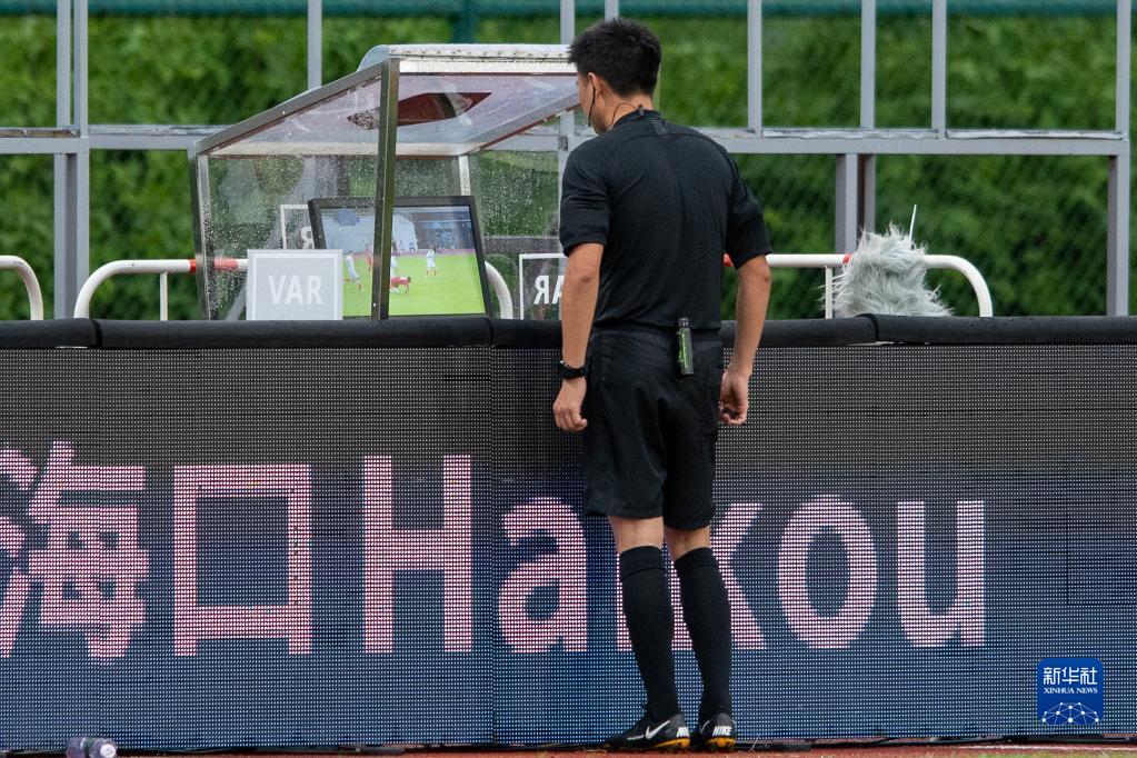 6月8日,主裁判李海新在比赛中查看视频回放。新华社记者 胡智轩 摄