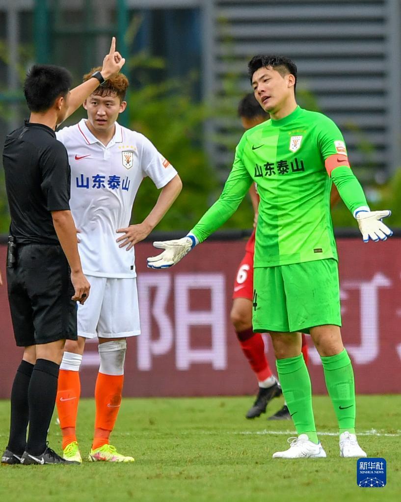 6月8日,山东泰山队守门员王大雷(右)在比赛中与主裁判李海新沟通。新华社记者 胡智轩 摄