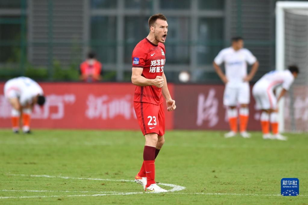 6月8日,河南嵩山龙门队球员舒尼奇在球队进球后庆祝。新华社记者 胡智轩 摄