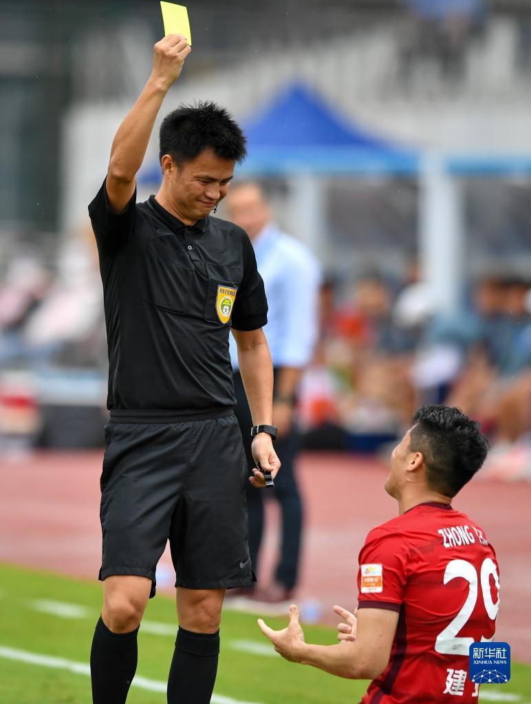 6月8日,主裁判李海新(左)在比赛中向河南嵩山龙门队球员钟义浩出示黄牌。新华社记者 胡智轩 摄
