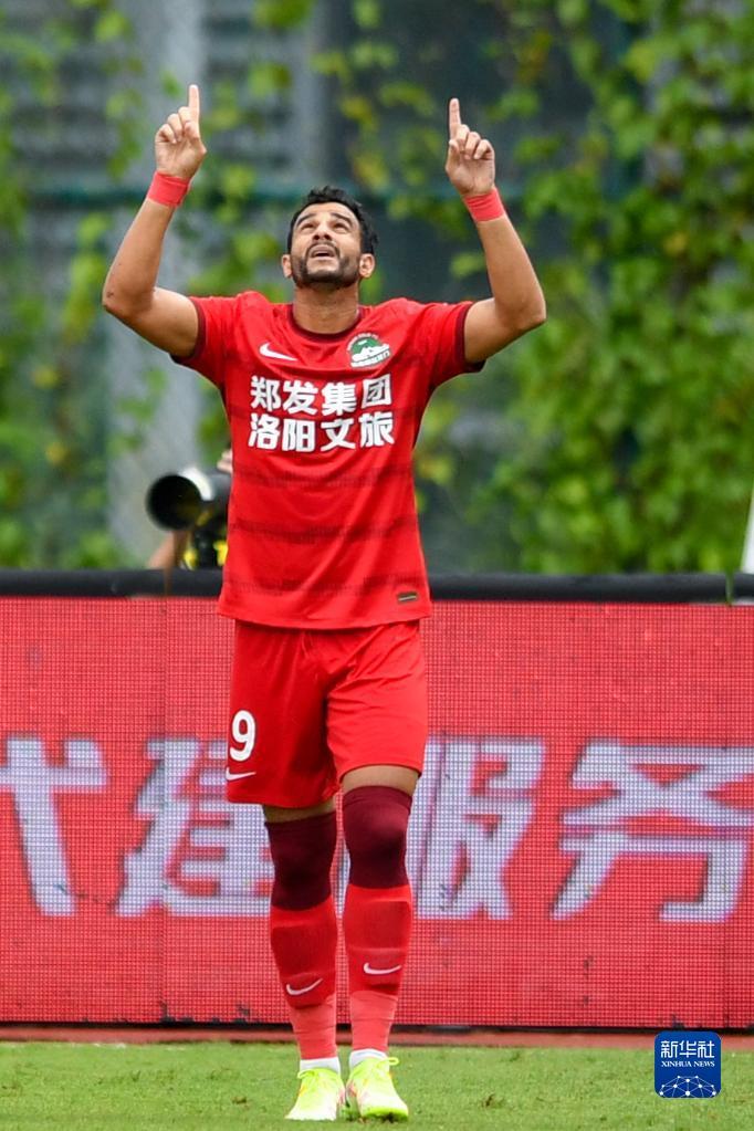 6月8日,河南嵩山龙门队球员恩里克·多拉多在进球后庆祝。新华社记者 胡智轩 摄