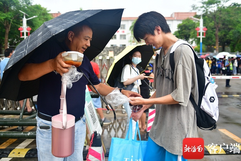 海南省农垦中学初中部考点,刚出考场,父亲就送来好吃的。记者 陈卫东 摄