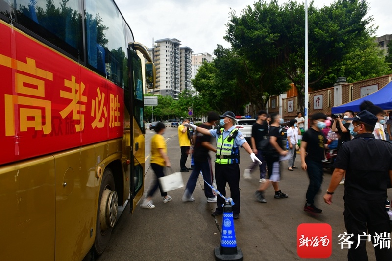 海南省农垦中学初中部考点,交警在协助外校考生从车上下来。记者 陈卫东 摄