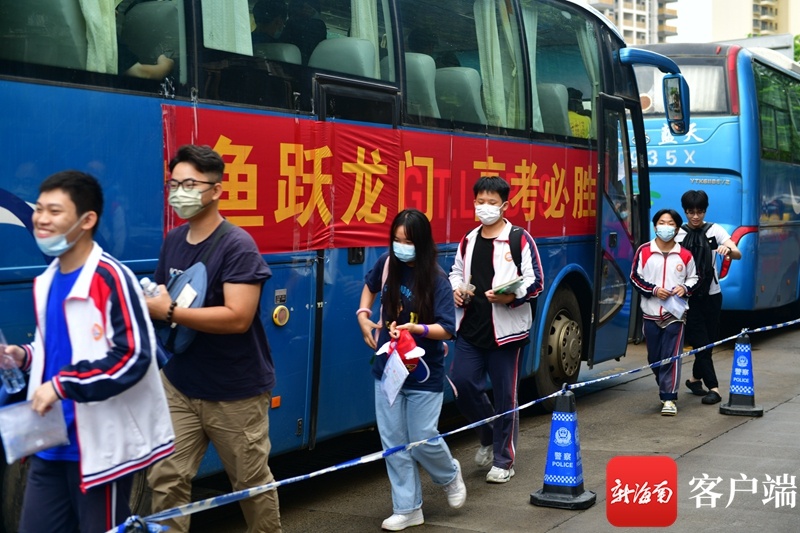 海南省农垦中学初中部考点,外校考生从车上下来。记者 陈卫东 摄