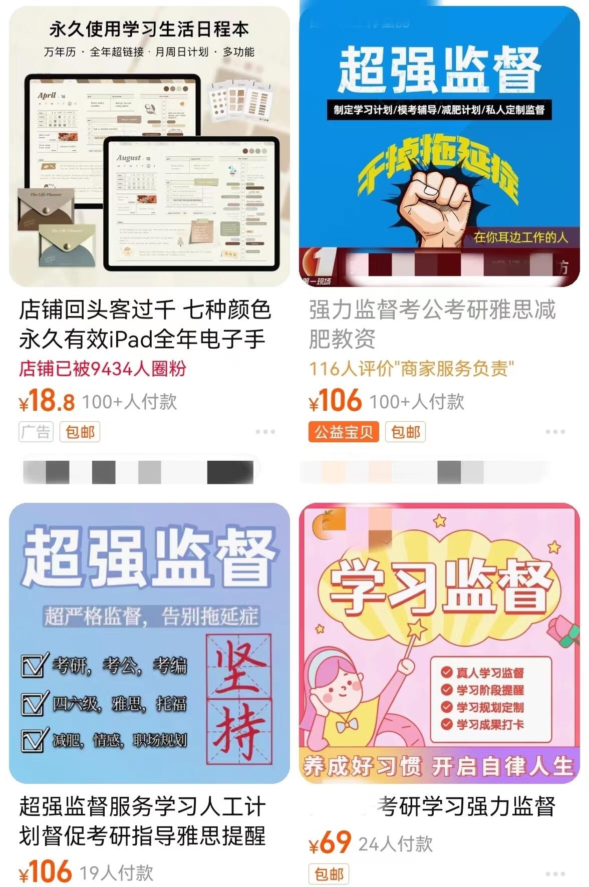 记者以顾客身份咨询了多家店铺。一家月销量过千单的店铺客服说,他们的服务范围主要以学习监督为主,比如考公、考研、雅思、托福等,不仅有线上自习室集中监督,还可以一对一服务。