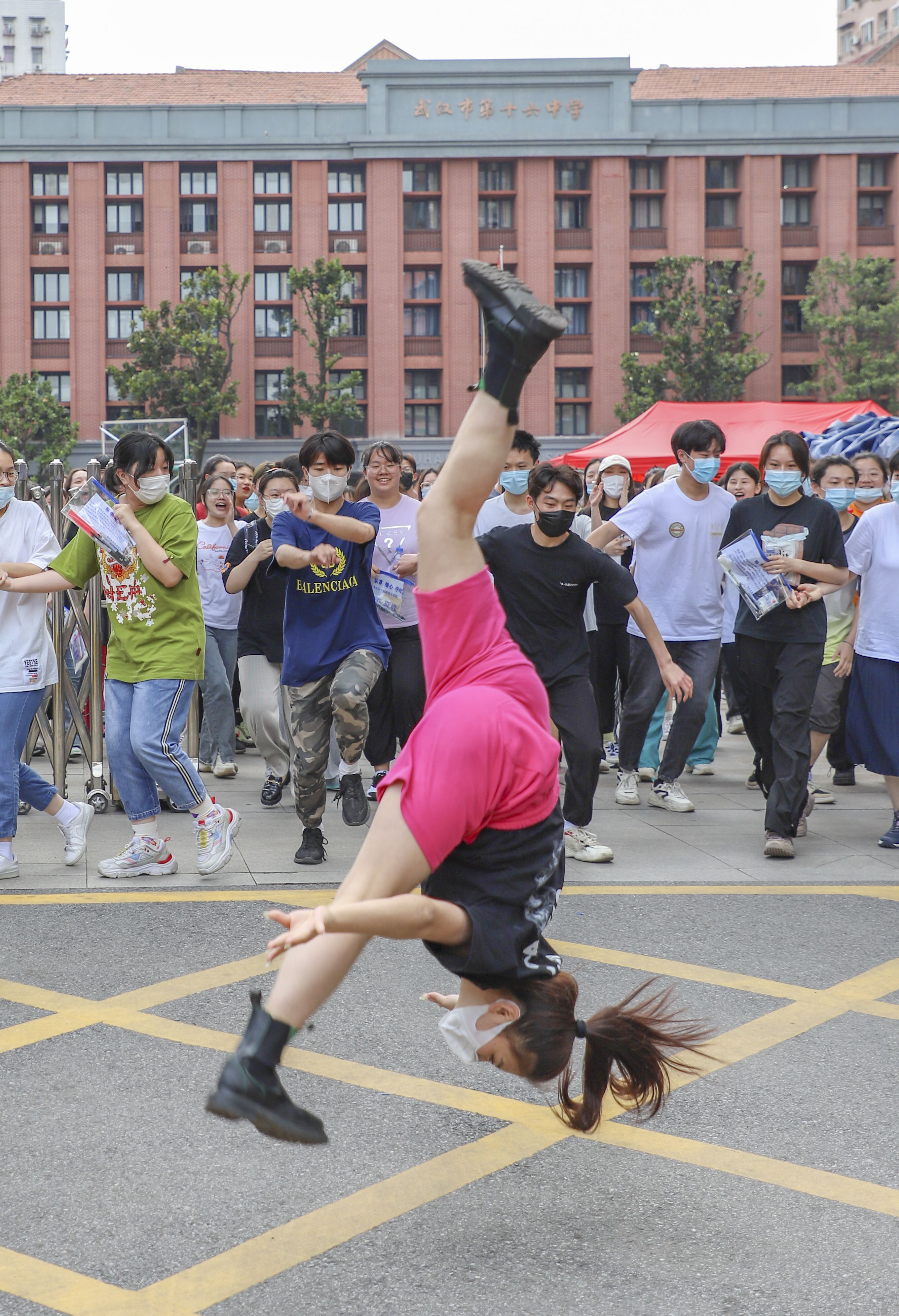 十六中考点外,女生兴奋地当众表演空手翻功夫,庆祝高考全部结束,后面的男孩也准备露一手。