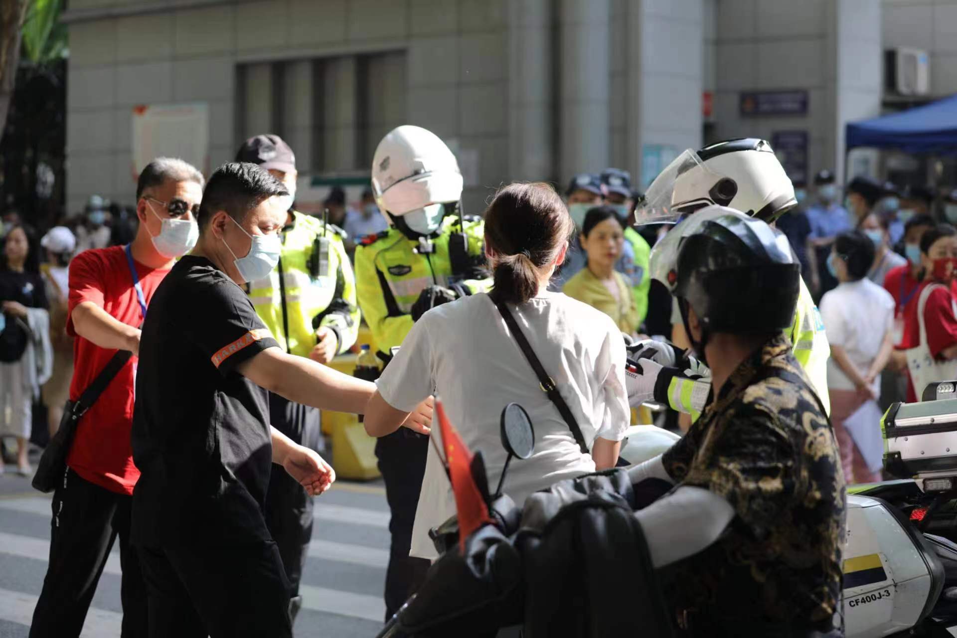这张照片在干吗?背后有个小故事。6月9日早上,爸爸送女儿高考,到了六中考点门口,发现没带准考证,连忙打电话给家里的妈妈。妈妈找到准考证后,送已经来不及了。她急中生智,向家附近的硚口交通大队一中队求援,中队长许尧派快骑队员李小雄、邓凯将准考证送达,有惊无险。