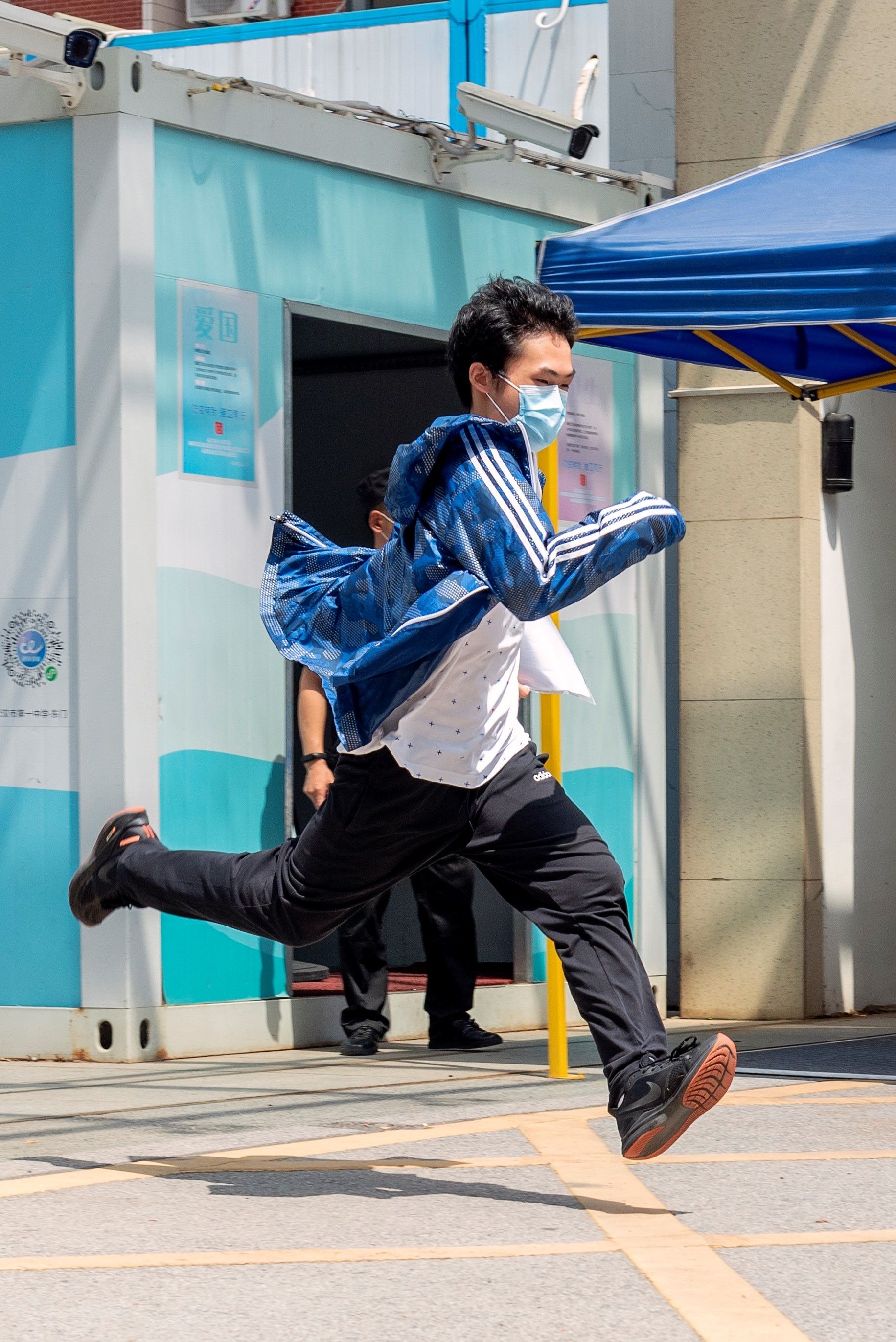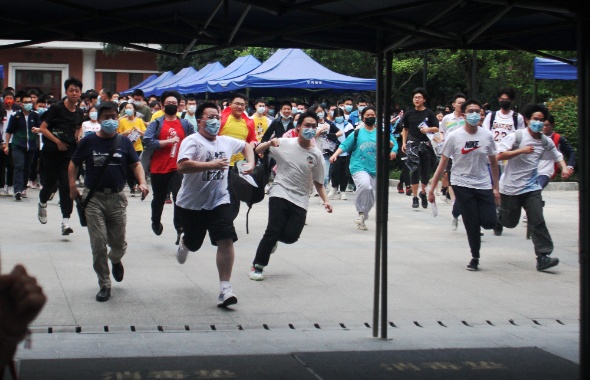 一中考点,一场考试结束后,男生奔跑出场。