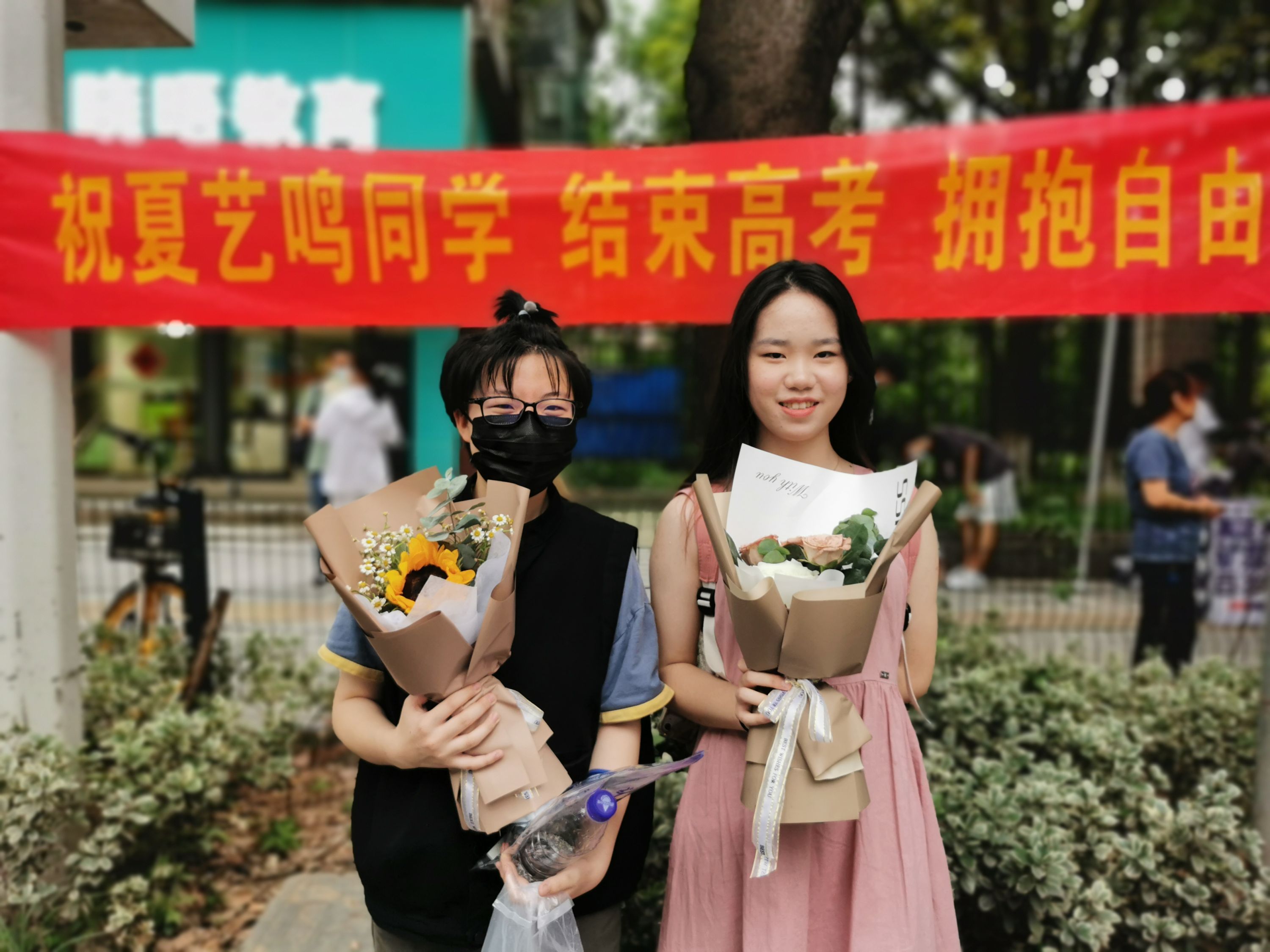 小刘为她小学就认识的朋友夏艺鸣拉出横幅,制造高考终场后的惊喜。