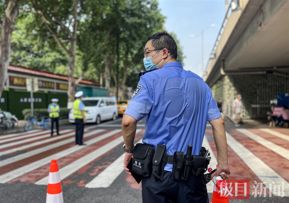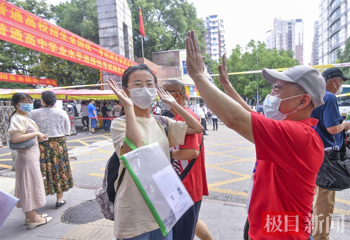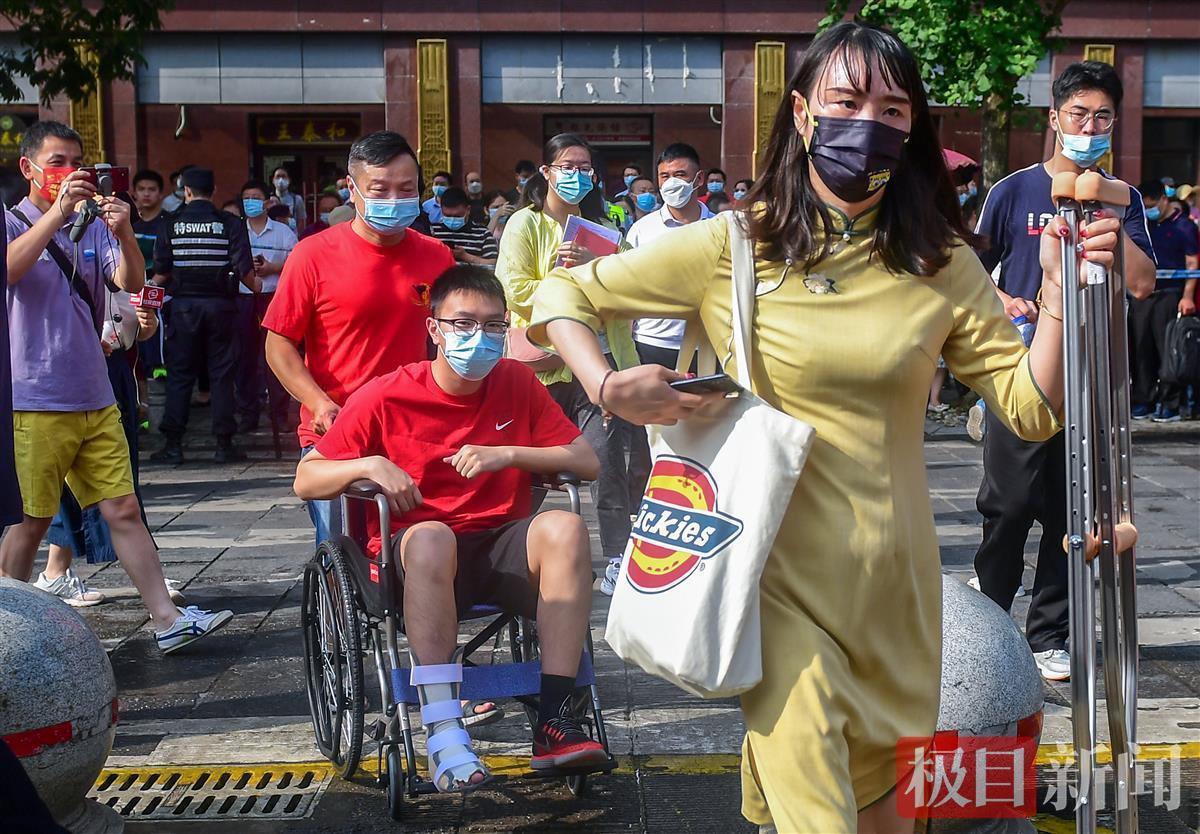武钢三中考点、钢城十六中考点、应城二中考点、十堰东风高中考点,那些坐着轮椅的考生、拄着双拐的考生,有执勤人员门的肩膀护送。